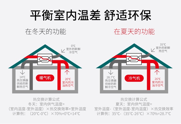 通风换气、能量回收和空气净化:将室外鲜鲜空气经过过滤后送入室内的同时,室外污浊空气排出室外,彻底改善室内空气品质;内置高效六边形全热交换核心,即使大冷天也依然可以不间断换气,-20℃以上均可实现热交换,有效防止房间过冷或机器受冻。