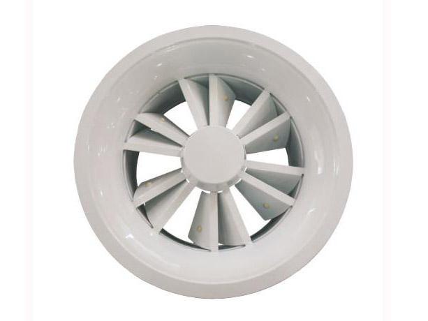 风口表面装有可调式叶片和散流圈,叶片根据流体动力学原理设计的,可以使气流形成具有一定初速涡旋流送出,从而使送风射程远,射流覆盖面大,增加气流的对流效果。